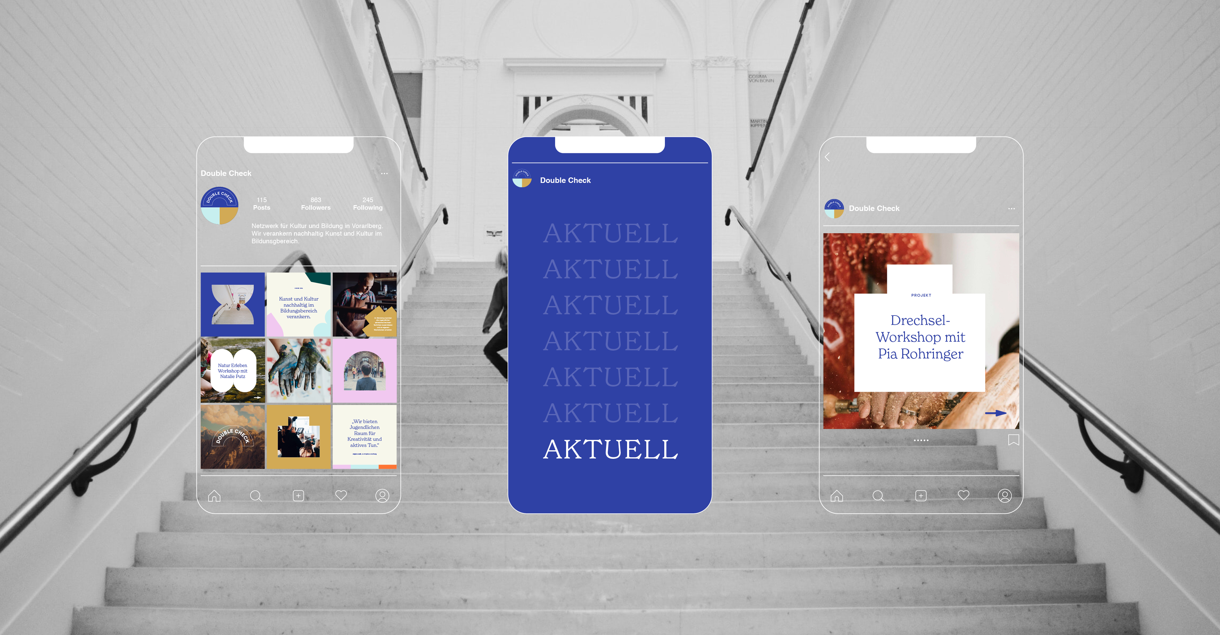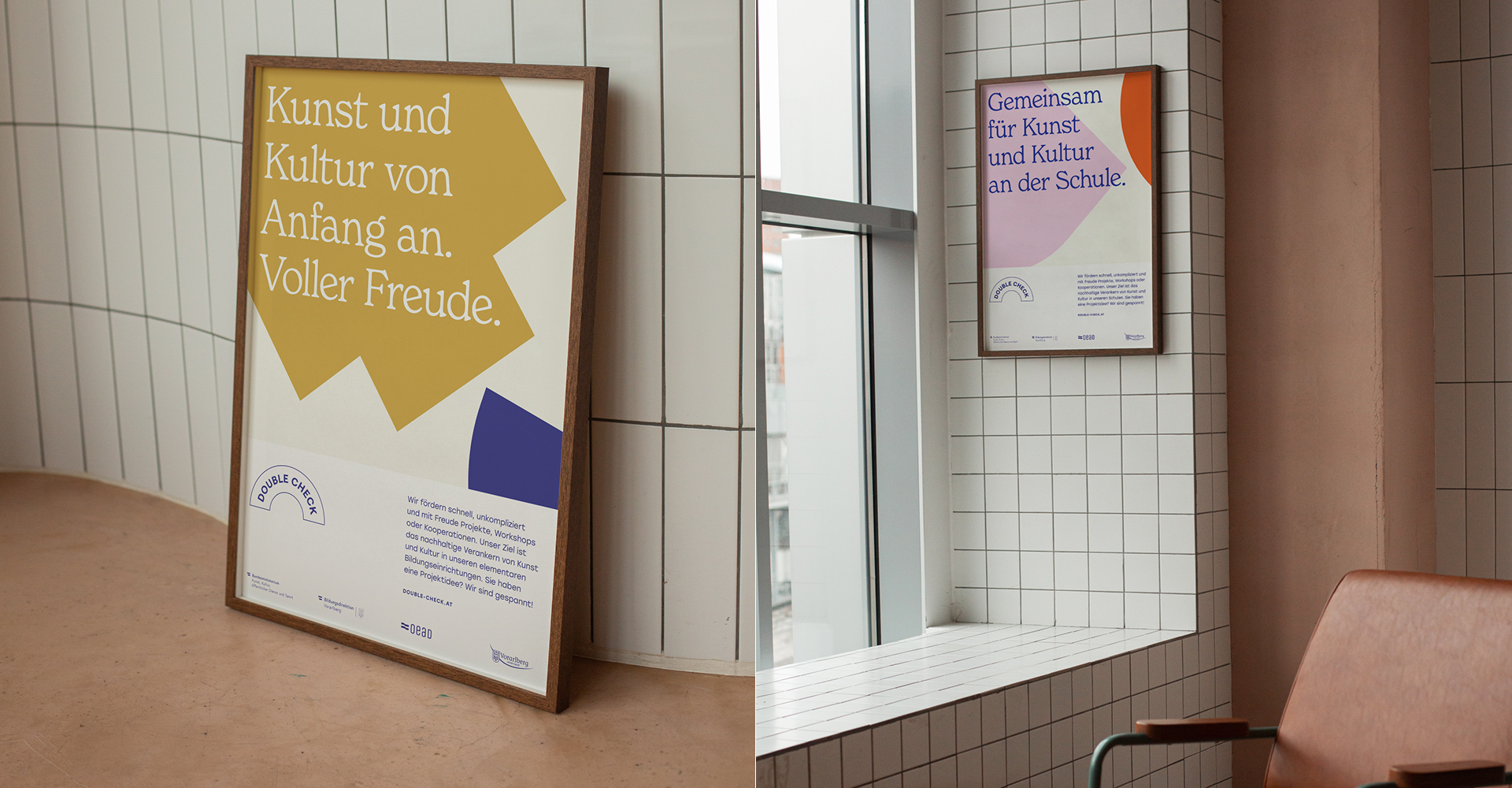 Double Check fördert die Integration von Kunst und Kultur in Bildung, und das von Anfang an. Der Vorarlberger Verein leistet großartige Arbeit für Kindergärten, Schulen und Lehrbetriebe. Ziel des visuellen Erscheinungsbildes war es, kulturelle Vielfalt und den freudvollen Zugang zu Kunst und Kultur auf den ersten Blick zu kommunizieren.
